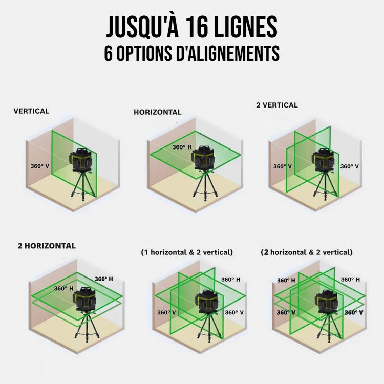 16 lignes au total : 2 alignements horizontaux sur 360°, 2 alignements verticaux pour une diffusion du faisceau sur toutes les dimensions possibles.